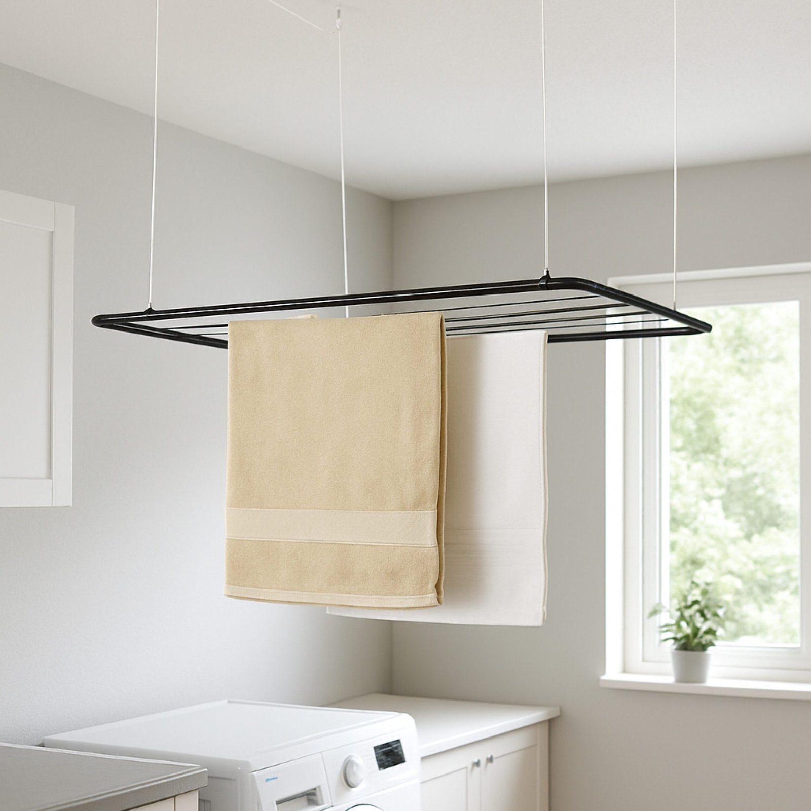 Varal de Teto Maxeb branco combina praticidade e leveza visual, sendo perfeito para ambientes claros e compactos. Possui sistema de cordas que facilita o ajuste de altura, tornando o processo de secagem mais acessível e eficiente. Com 6 varetas e fixação no teto, proporciona excelente aproveitamento de espaço, mantendo o ambiente organizado e funcional. Suportando até 13kg e 7,2 metros para estender roupas. O acabamento branco oferece discrição e harmonia com diversos estilos de decoração.